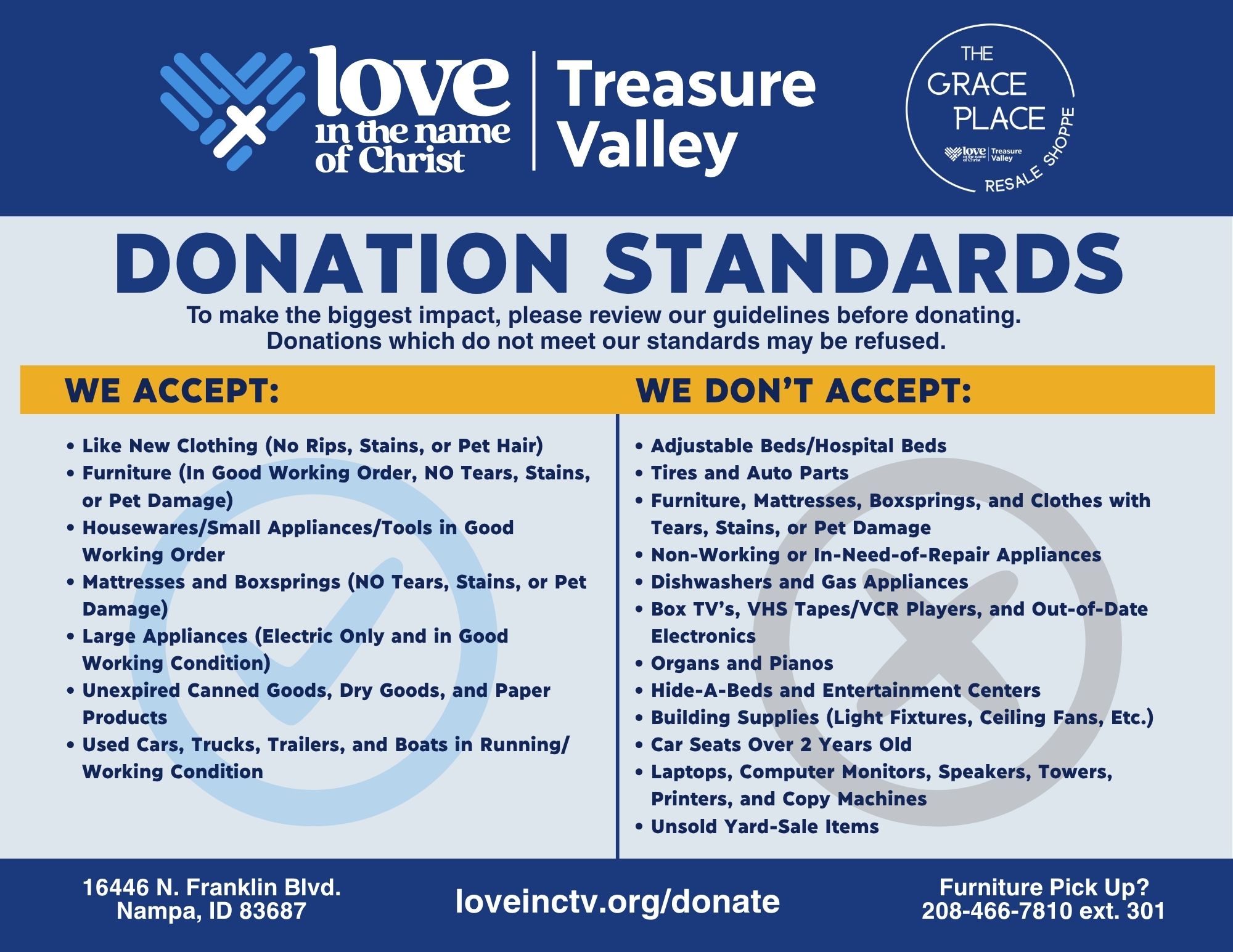 Please note: Our staff reserves the right to accept or decline donations on site if they do not meet our current standards.