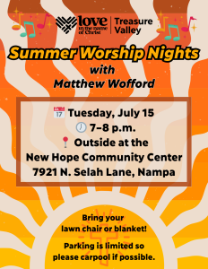 You’re invited to join us for a special Summer Worship Night on Tuesday, July 15, from 7-8 p.m. at the New Hope Community Center! Bring your lawn chair or blanket and come enjoy an uplifting evening of worship and connection as we gather together in praise with music led by Matthew Wofford. It’s a beautiful way to refocus and be refreshed in the middle of the summer season. All are welcome!