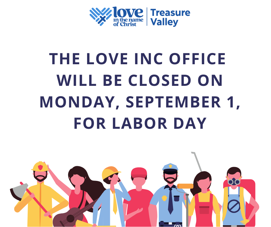 The Love INC Office will be CLOSED on Monday, September 1. The Grace Place and Donation Center will be OPEN their regular hours so stop by and see us: Donation Center:  9am - 4pm, The Grace Place: 10am - 5pm